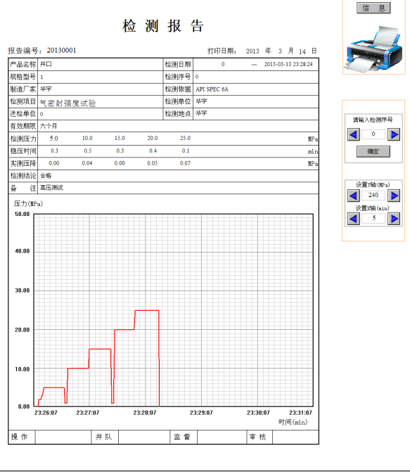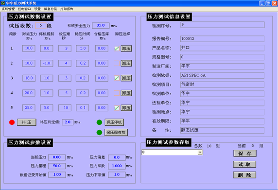 其工作原理是:在強(qiáng)大的程序控制系統(tǒng)支持下,實(shí)現(xiàn)全中文視窗操作,通過(guò)設(shè)置壓力測(cè)試過(guò)程中的各種參數(shù),利用數(shù)據(jù)采集系統(tǒng)、程序控制系統(tǒng)、電器控制系統(tǒng)實(shí)現(xiàn)自動(dòng)化控制。主要功能有:(1)可以實(shí)現(xiàn)自動(dòng)升壓、保壓、停機(jī)、卸荷等功能;(2)對(duì)壓力測(cè)試參數(shù)可以自由設(shè)置和控制,并將測(cè)試數(shù)據(jù)或曲線打印并儲(chǔ)存;(3)同時(shí)具有手動(dòng)操作功能和系統(tǒng)狀態(tài)報(bào)警功能;(4)該系統(tǒng)還可以實(shí)現(xiàn)對(duì)于測(cè)試井口名稱、編號(hào)、施工單位、測(cè)試人員進(jìn)行搜索、查詢、調(diào)用、存檔等數(shù)據(jù)管理功能。